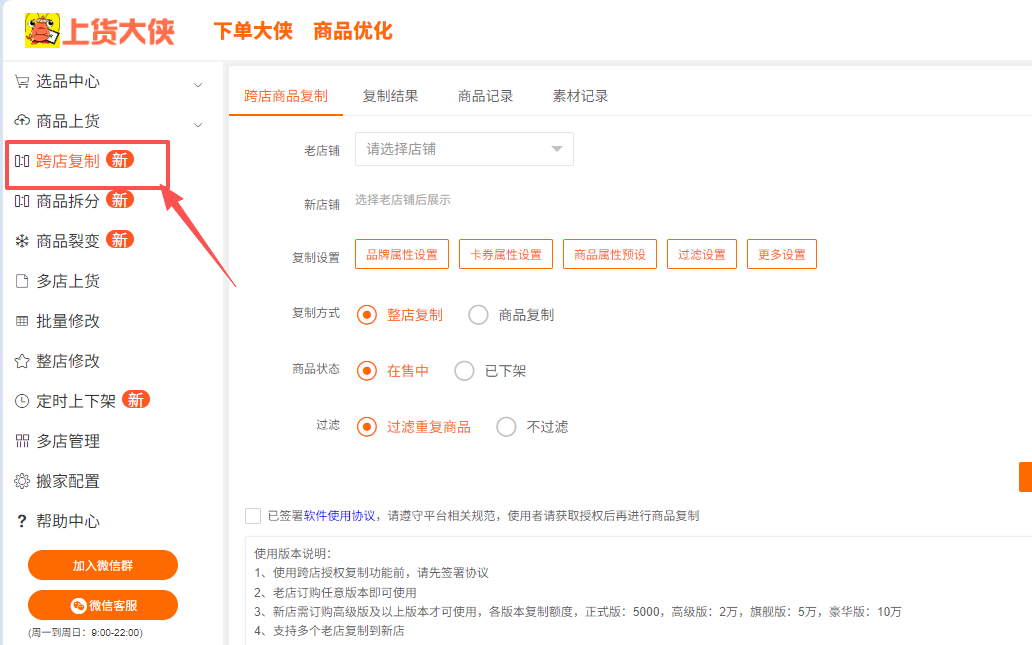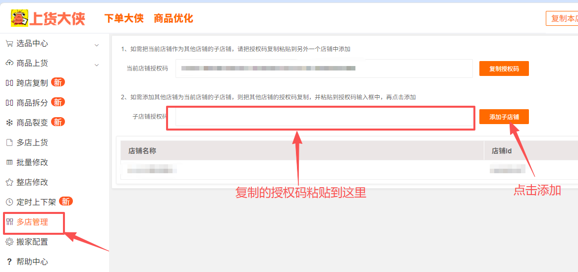首先,用另外的浏览器重新打开上货大侠,登录老店铺,然后点击多店管理,复制截图中的授权码,如下: