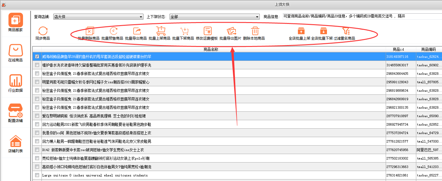 下载下来的商品可以进行批量处理,选择您所需要的功能,然后点击对应的按钮即可对商品进行相应的处理,如下图: